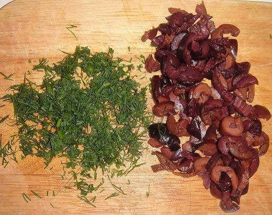 Мелко рубим укроп и нарезаем маслины (предварительно вынув косточки, если таковые были).