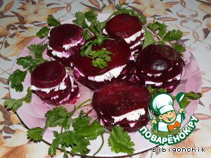 • Свеклу порезать на кружочки. Положить на кружочек творог, затем снова свеклу, снова творог и так далее. Заканчиваем свеклой. Сверху поливаем заправкой и украшаем петрушкой.