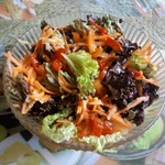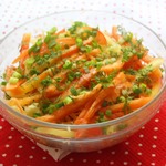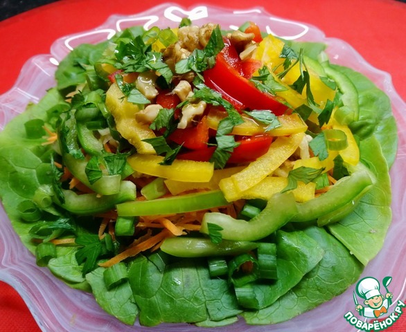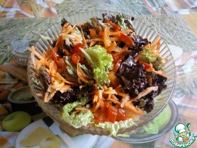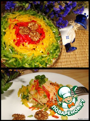 Морковь (сырую), яблоко, перцы натираем или режем тонкими полосками по мере укладывания в салатницу,