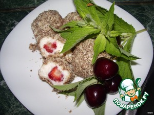 Мокрой рукой берем часть творога, формируем лепешку, в серединку кладем клубничку и аккуратно все залепляем.