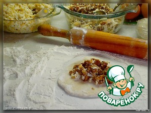 Итак, тесто у нас готово и ждёт своего часа. Отрываем кусочек теста размером с шарик для пинг-понга. Раскатываем тесто до 2-3 мм толщиной. Кладём на серединку начинку. Складываем треугольнички, квадратики и т. п. -