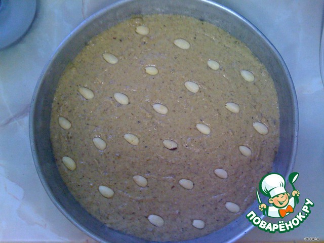 Тесто выкладываем на противень, можно украсить сверху орешками, и отправляем в духовку, пока пирог не приобретет светло-коричневый цвет, в электрической духовке готовим на цифре 5.