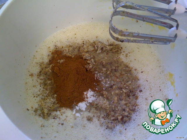 Тесто: яйца взбиваем с 0,5 сахара до пены и постепенно добавляем следующие ингредиенты: молоко, масло, орехи, ванильный сахар, корицу. Постоянно взбиваем. -