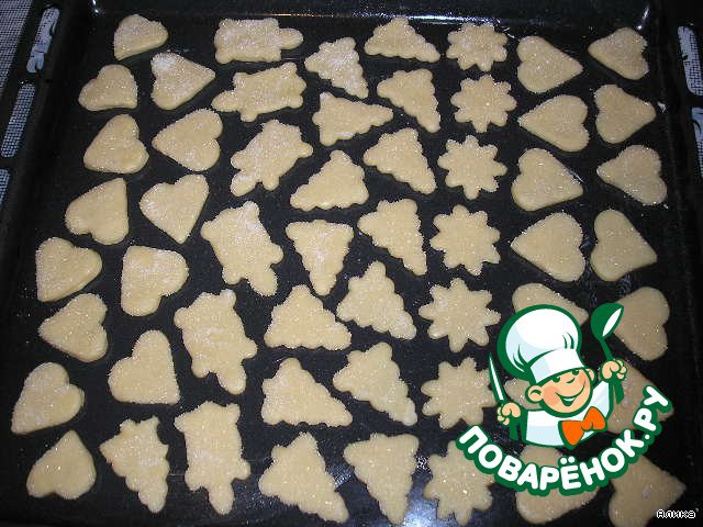Берем фигурку, обмакиваем в сахаре с одной стороны и кладем на противень.