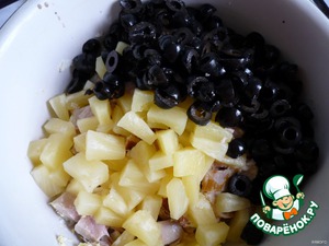 Копченое куриное филе порезать крупно (кусочки размером с маслину), яйца на 8 частей, открыть ананасы и маслины, жидкость слить, ананас добавить к птице и яйцам, маслины целые или разрезать пополам