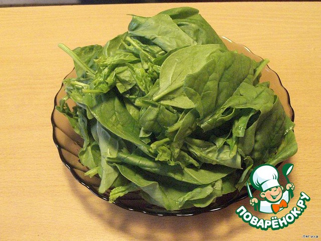 Опускаем шпинат в кипящую воду на 2-3 мин. Достаем и ждем когда остынет.