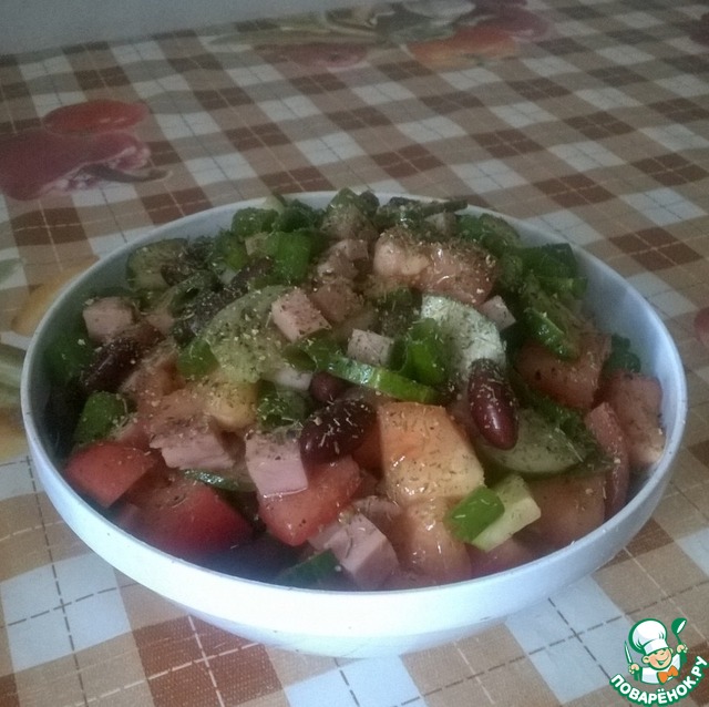 Далее режем мясо, огурец, помидор, выкладываем фасоль из банки. Сливаем жидкость с лука, слегка промываем его водой (когда есть яблочный уксус, я не промываю), добавляем в салат.