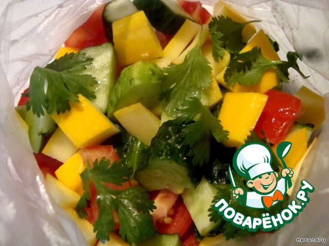 Овощи нарезаем довольно крупными кусочками, складываем в полиэтиленовый пакет. Выдавливаем в пакет чеснок, выливаем масло и соевый соус, выжимаем сок лимона, перчим. Добавляем нарубленную кинзу. Пакет завязываем и встряхиваем несколько секунд, что бы все перемешалось и "подружилось". Овощи в пакете убираем в холодильник на полчаса для маринования.