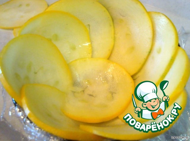 Начнем с приготовления кабачкового салатника. Кабачок очень тонко нарезать кружочками.