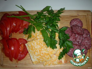 2. Также ломтиками нарезаем помидоры, сыр и колбасу.