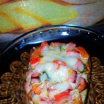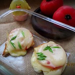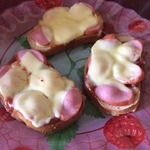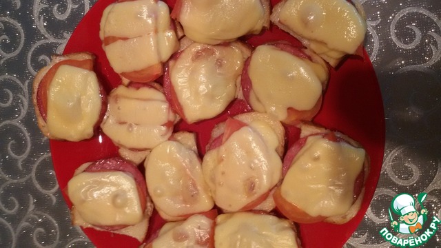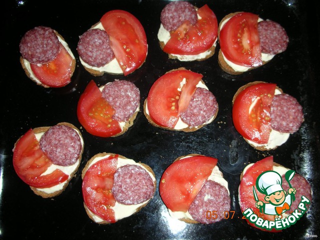 4. Далее кладем по кусочку помидорчика и колбаски.