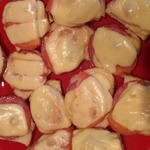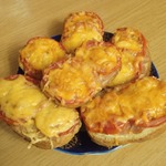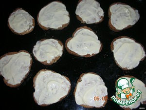 3. Каждый кусочек багета смазываем майонезом и укладываем на противень. (Хозяйка, которая научила меня этому способу, вместо майонеза использовала сливочное масло)