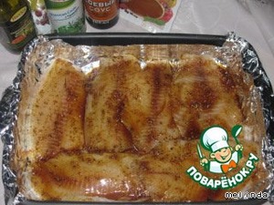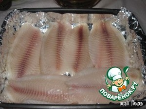 Филе промыть,обсушить.Форму для запекания застелить фольгой и выложить филе
