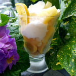 2. Консервированный ананас режем помельче, сбрызгиваем лимонным соком и закладываем в бокал вторым слоем.