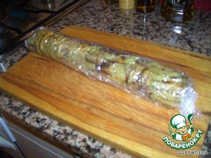 А теперь собираем рулет. Выкладываем на стол прозрачную полиэтиленовую ленту, укладываем вдоль баклажаны, чтобы один слегка накрывал другой.