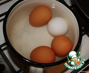 Сварим яйца всмятку (2 минуты после закипания воды). Охладим.