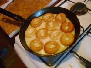 Выложить сушки на сковороду, залить яйцами, закрыть сковороду крышкой
