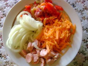 Через 3-5 минут выложить овощи сверху и снова закрыть крышкой