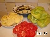 Далее жарим по отдельности слоями каждый вид овощей в казане или в сковороде на растительном масле до готовности (мягкости) и выкладываем остывать. Яйца жарим как на яичницу. Помидоры можно не жарить, но жаренные они становятся мягкими.