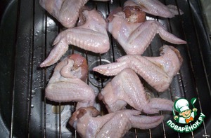 • в духовку на нижнее деление поставить поддон с водой, разогреть духовку до 280-300*С, решетку с крыльями поставить в духовку на верхнее деление на 50 минут