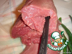 • В кусках баранины делаем глубокие прорезы внутри (не насквозь), таким образом, чтобы получились "кармашки".