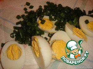 • Варёные яйца разрезаем пополам вдоль, а зелёный лук мелко рубим.