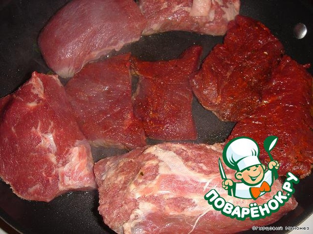 Это блюдо представляет собой финальную часть встречи викинга Эрика с драконом. Так как человечины в магазине не было, то мы берeм баранину, ибо викинг баран, что решил попытать счастье в битве с драконом, несмотря на уговоры домочадцев. Ну, коню тоже досталось, так что нам понадобятся несколько кусочков конины...