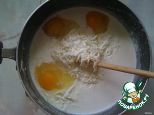 муку обжарить в кастрюльке, без добавления масла или чего-либо, когда слегка потемнеет, влить молоко, закипятить и остудить. В еле тепленькое, вбить яйца и всыпать натертый сыр. Поставить на медленный огонь и помешивая поварить минут 10 , сыр слегка подтает.
