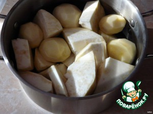 • Порезать сельдерей крупными кусочками и картофель. Отварить все вместе в подсоленной воде. Воду слить (сохранить), обсушить овощи. Пока горячие - влить молоко, положить половину масла, сделать пюре. Добавить отвара от сельдерея, сколько надо, чтобы получилось жидкое пюре.