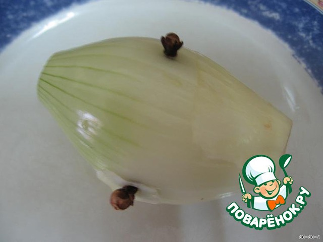 2-3 гвоздички воткнуть в очищенную луковицу (в конце варки выбросить луковицу). Всё опустить в воду. -