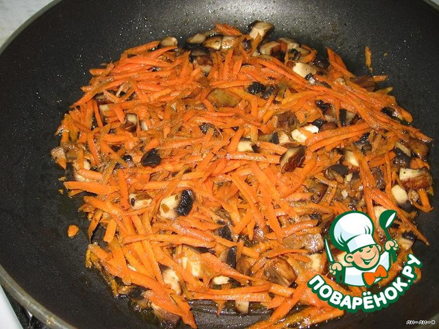 На раст. масле обжарить грибы и морковь, натертую на терке.