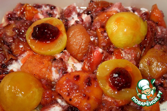 Сливы и груши порезать на небольшие кусочки,а две сливы и четыре ежевики оставьте для украшения.