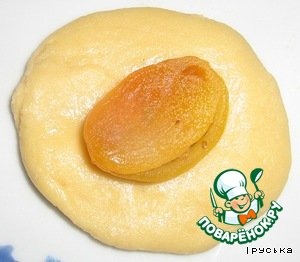 Из теста слепить маленькую лепешечку, в центр положить курагу.