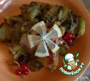 Смазываем противень маслом и выкладываем на него картофель, нарезанный тонкими ломтиками. Сверху - куски курицы, все солим и отправляем в горячую духовку запекаться до полуготовности.