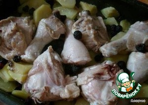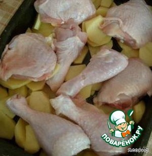 Смазываем противень маслом и выкладываем на него картофель, нарезанный тонкими ломтиками. Сверху - куски курицы, все солим и отправляем в горячую духовку запекаться до полуготовности.