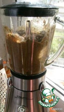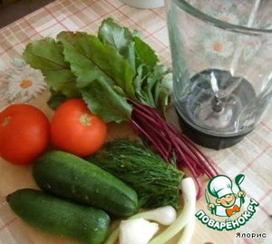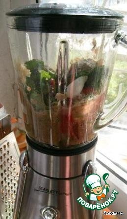 В это время готовим соус: в блендере взбиваем томаты, зелень, приправы, кабачки и лук.