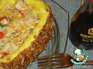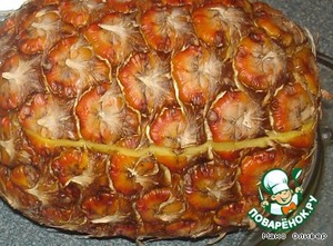 • Выкладываем в ананас начинку, закрываем крышкой и отправляем в духовку, разогретую до 200 градусов, на 40 минут.