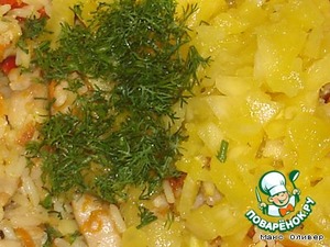 Объединяем с рисом, добавляем натёртый сыр и измельчённый чеснок.