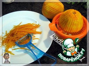 Между тем с (помытых, а еще лучше обдать кипятком) апельсинов снимаем цедру и путем только вам известным добываем драгоценную влагу в виде сока.