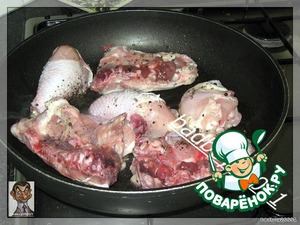Курицу или окорочка вымоем (обязательно!! не забываем про куриный грипп), просушиваем, разрезаем на порционные кусочки, солим, перчим и отправляем на разогретую сковородку слегка навести румяна...