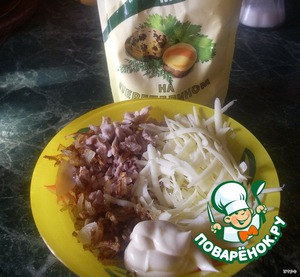 Лук обжариваем на растительном масле. Отварную курочку режем, сыр трем. Все это перемешиваем и заправляем майонезом.