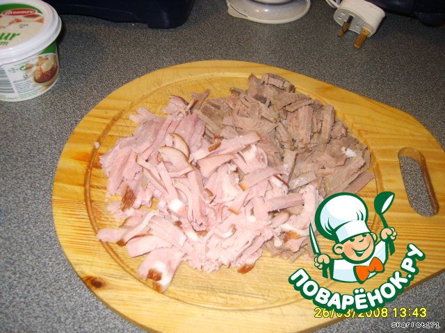 - Мясо (отварное, говядина и свинина, вкуснее когда 2 вида мяса) — 300 г