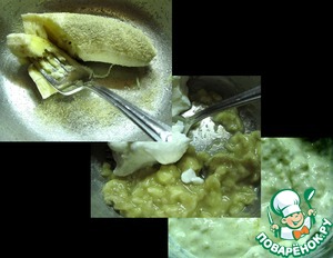 Для заправки: банан с солью и перцем размять вилкой, добавить сметану/крем-фреш, лимонный сок, взбить вилкой.