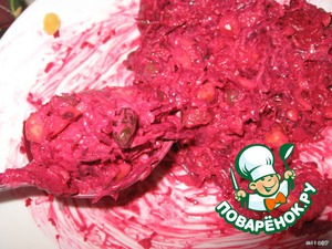 Смешиваем все необходимое для красных шариков заправляем майонезом, тщательно перемешиваем.