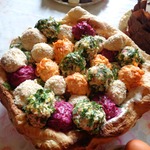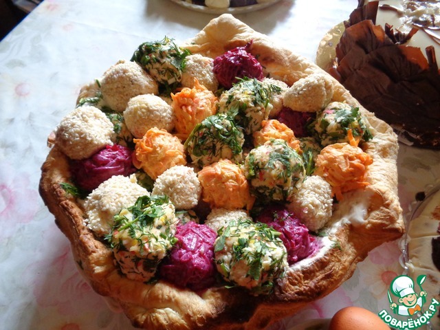 Невероятная простая... нарядная закуска... на тот случай, чтоб "угодить всем". Красные шарики из свеклы, изюма и орехов порадуют милых дам своим сладко-ореховым вкусом... Морковные шарики с добавлением чеснока и сыра порадуют мужскую половину своей остротой и приятным вкусом... ну а зеленые шарики из огурца, редиса и картофеля никого не оставят равнодушным своим свежим вкусом.... Вот так все до боли знакомо и невероятно вкусно!!!! На конкурс "Овощной светофор"...