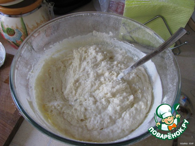 Муку. Муку добавляем "на глаз", потому что ее количество зависит от жирности кефира и творога. Тесто должно липнуть к рукам. Затем берем тесто ложкой и выкладываем на доску, посыпанную мукой, аккуратно делаем лепешки.