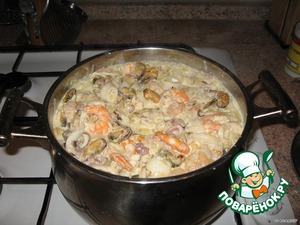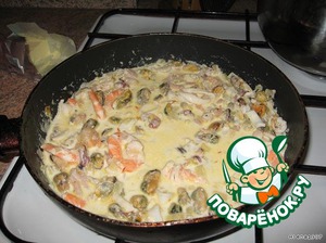 В кипящие сливки небольшими порциями добавляем плавленый сыр, а потом добавляем отваренный морской коктейль, тушим под крышкой 10 минут. -