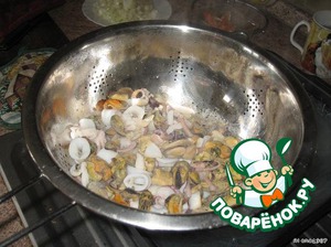 Морской коктейль отвариваем до готовности (15 минут) и откидываем на дуршлаг