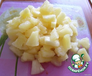 Так же нарезаем ананас (вообще в рецепте был свежий, но я не очень люблю свежие ананасы, да и чистить не хотелось, поэтому у меня консервированный).