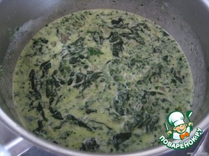 Добавляем шпинат и тушим, пока он не уменьшится в объеме в несколько раз;